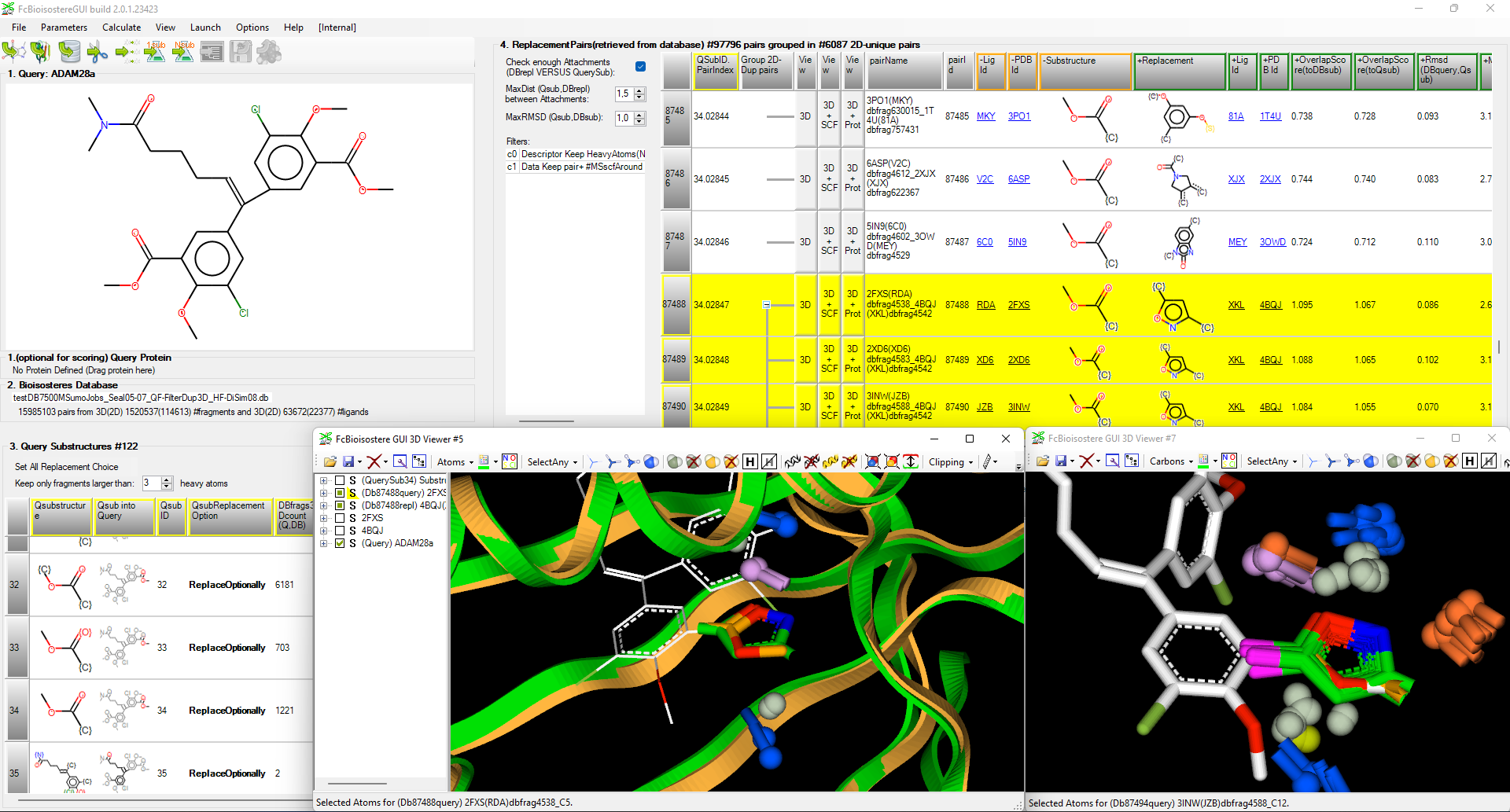 Fig.: Replacement of hydrolysable methyl ester chemical moiety on ADAMs ligand query (pdb code 3SI9) with FcBioisostere ; on the left, upper view shows the input 2D or 3D query, lower table shows all query substructures to select the area to replace ; on the right, upper table shows all found replacement pairs, the selected pair is yellow was detected in 121 PDB pairs, lower view shows first the query ligand in white with the protein-fragment pairs in green and orange, then on the right, some of the 121 pairs of methyl-ester by 1,2-oxazole replacement.